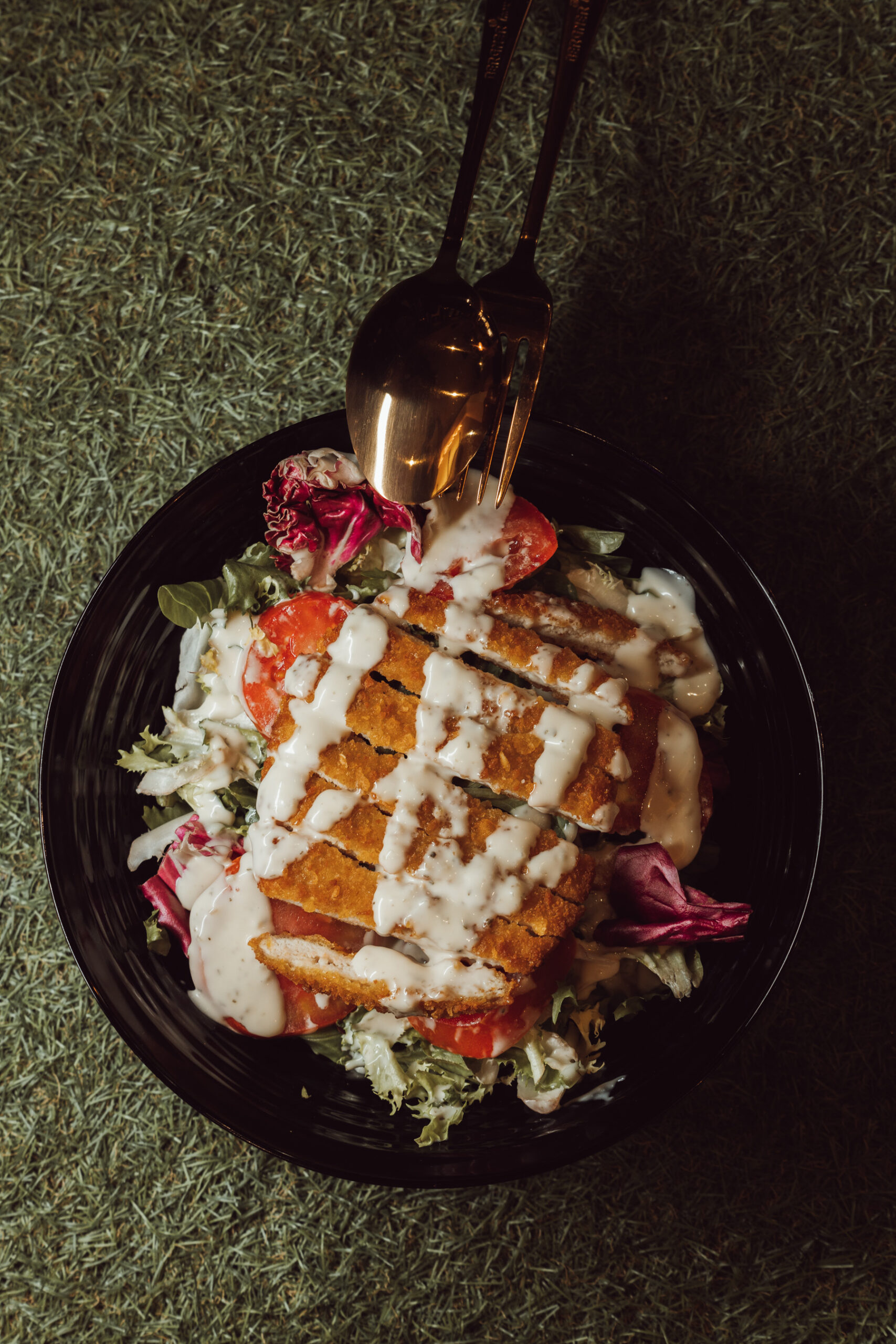 Pan Bao al vapor relleno de pollo rebozado al estilo japonés, salsa cremosa kimchi y salsa teriyaki