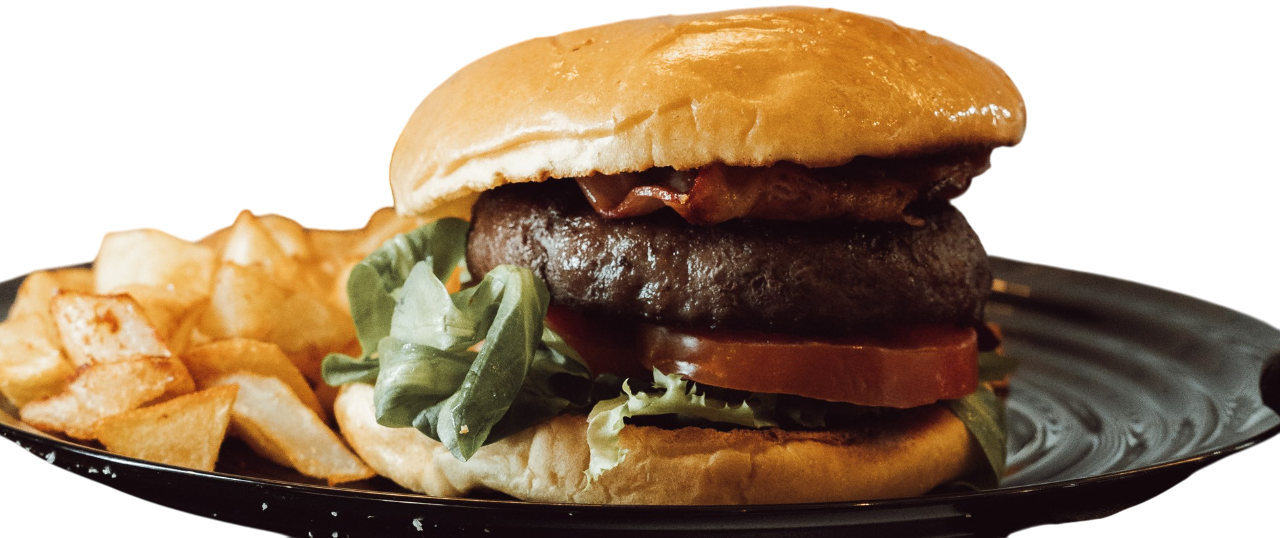 Pan de patata rojo carne premium de txuleta de 200gr de chicharron con salsa ahumada, huevo escalfado a baja temperatura, cebolla caramelizada, extra de queso, panceta de cerdo con un sirope de bacon y fritos por encima